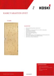 Kaski-paneeliovet valmistetaan Suomessa nykyaikaisella teknologialla ja korkealaatuisista, testatuista materiaaleista. Valmistusprosessissa painotetaan kestävää kehitystä ja ympäristöystävällisyyttä, joten jokainen ovi on sekä laadukas että vastuullisesti tuotettu. Oven massiiviliimapuurunko on 40 mm vahva. VO4AL ovessa ulkopuolen pintamateriaalina käytetään mäntypaneelia STV 12 x 95 mm ja sisäpuoli on paneloimaton ja oven kokonaisvahvuus on 52 mm. VO4AL on eristämätön ja tiivistämätön paneeliovi. VO4BL on eristetty versio varaston paneeliovista. Ovi on paneloitu ulkopuolelta mäntypaneelillla STV 12 x 95 mm ja sisäpuolelta vaneroitu 6 mm havuvanerilla. Oven kokonaisvahvuus on 57 mm. VO4BL-paneeliovessa on EPS-eristys ja 1-kertainen tiivistys karmissa.