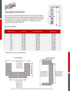 Välioven toimitukseen sisältyy ovilehti, lukkorunko ja kiinnitysruuvit karmin saranoihin. Toimitukseen ei automaattisesti kuulu välioven karmia, kynnystä, painiketta ja peite-/avain- tai WC-helaa, vaan ne on ostettava erikseen.