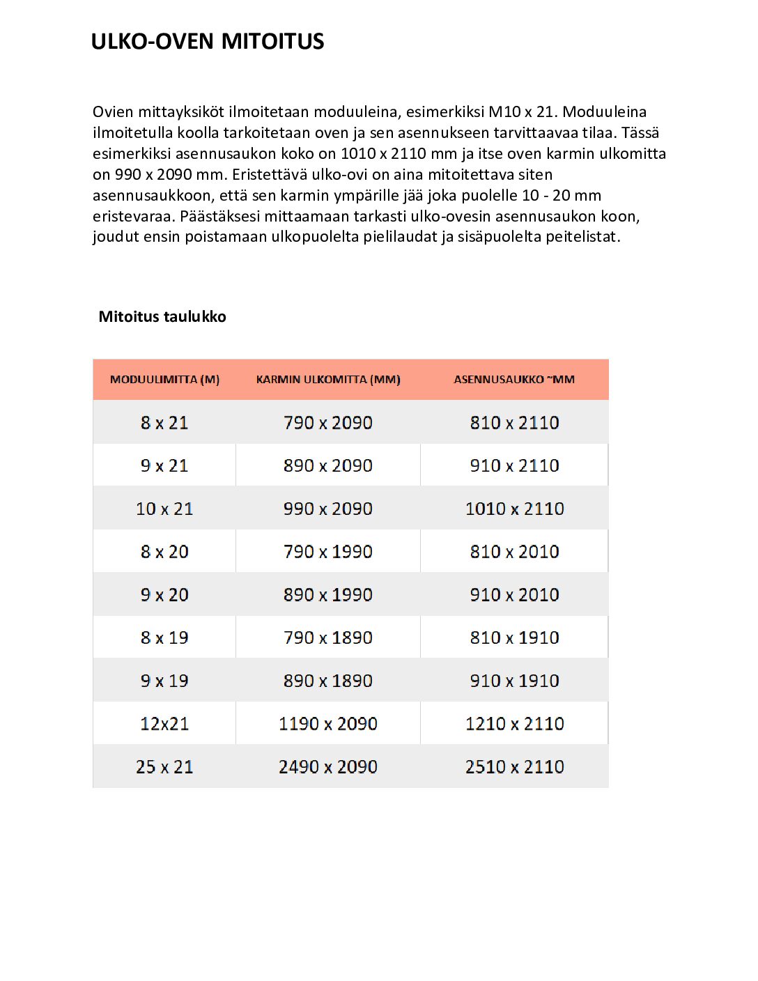 Oven karmin koko valitaan asennusaukon koon perusteella siten, että oven karmin ja asennusaukon väliin jää 20 – 30 mm eristysvaraa. Esimerkiksi 810 x 1910 mm asennusaukkoon voidaan valita vakiokokoinen 8 x 19 ovi (790 x 1890 mm).