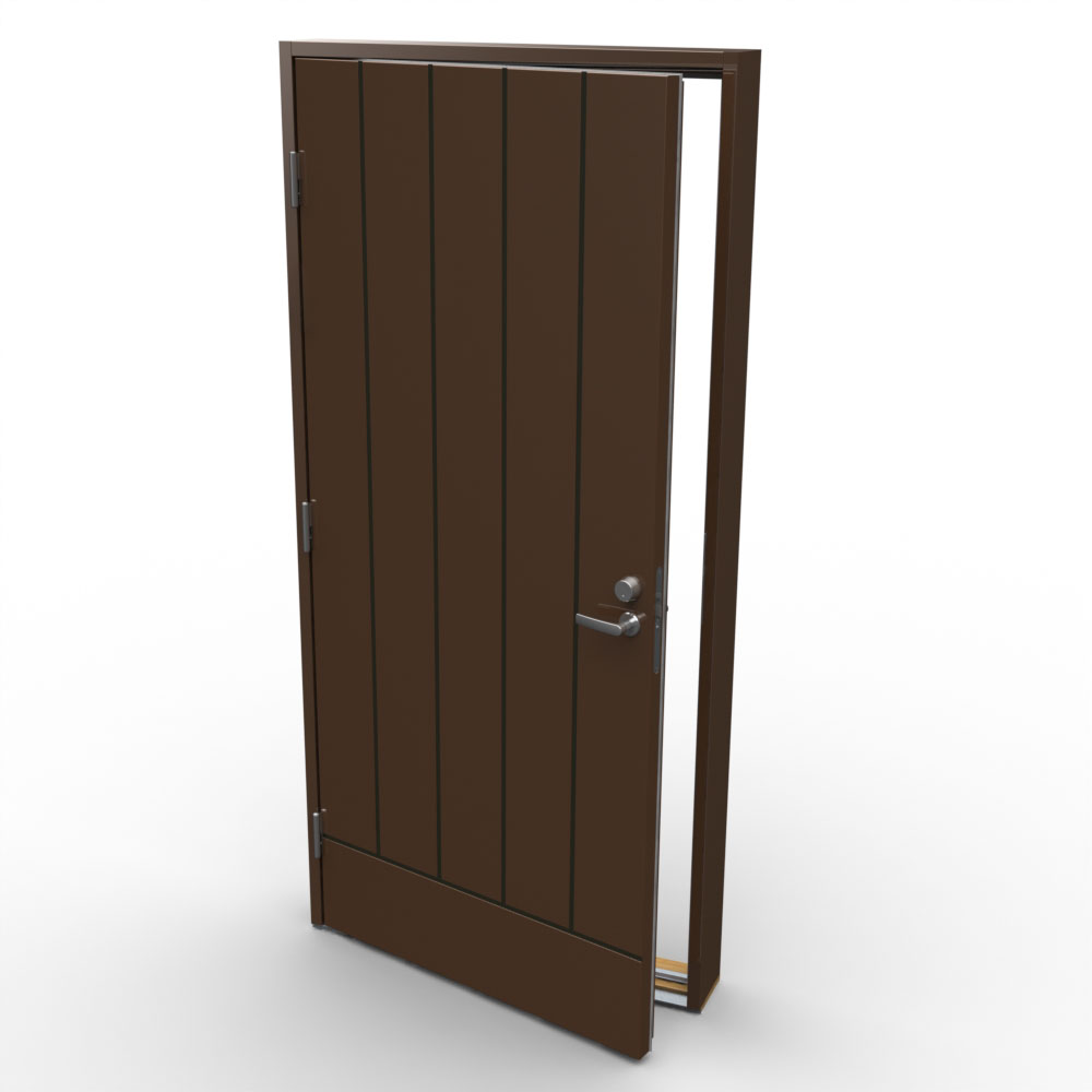 Lämpöeristetty 60 mm vahva ovilehti. Molemmat oven pinnat on alumiinilevyin vahvistettu. Oven pinta säänkestävä HDF-pinta maalattu tummanruskea RR32. Ulko- ja sisäpuolelta sileä.
