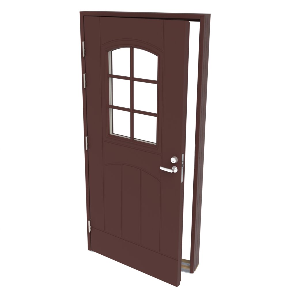 Lämpöeristetty 76 mm vahva ovilehti. Molemmat oven pinnat on alumiinilevyin vahvistettu. Oven pinta säänkestävä HDF-pinta maalattu tummanruskea RR32. Ulkopuolella urakuvio ja sisäpuolelta sileä.