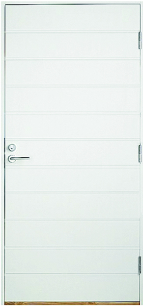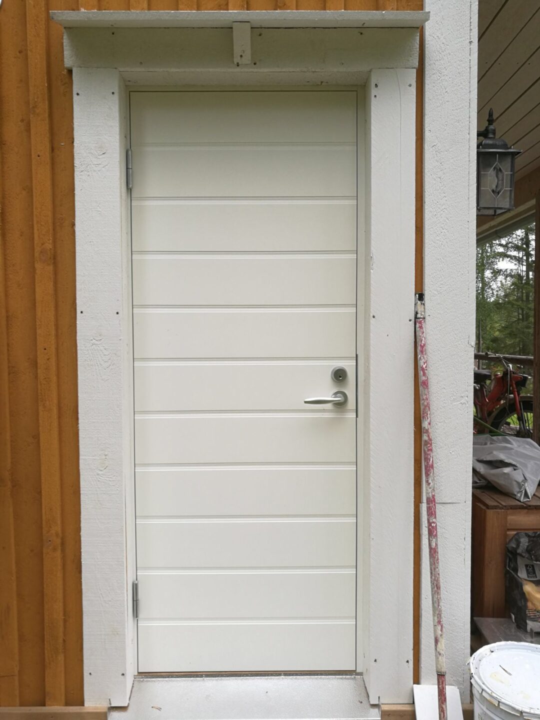 Säänkestävä perusovi, joka sopii erinomaisesti varaston ulko-oveksi.